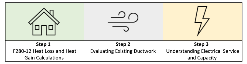 Step 3 – Understanding Electrical Service and Capacity: A common outcome with a heat pump retrofit is increased amperage use in a home. As such, prior to equipment selection, a qualified contractor should assess the home’s electrical loads using the Meter Data Method (preferred) or Traditional Method to determine whether the existing electrical system has sufficient capacity to support the new heat pump system, including any supplementary heating. If electrical limitations exist, homeowners may need to consider upgrading service amperage from the utility, replacing an outdated electrical panel, rearranging circuits on the panel, or adding a subpanel.