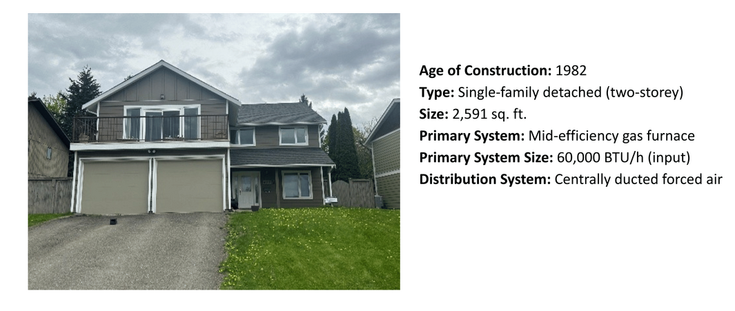 For our case study, we’re using a Kamloops home that has a mid-efficiency gas furnace (~80% AFUE) and looking to upgrade to a heat pump to improve energy-efficiency, reduce greenhouse gas emissions, and provide better all-year comfort with whole home cooling.