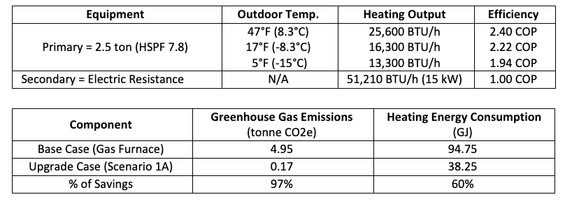 - In Scenario 1A, the heat pump retrofit models 60% energy-savings and 97% greenhouse gas emissions reductions against the base case.